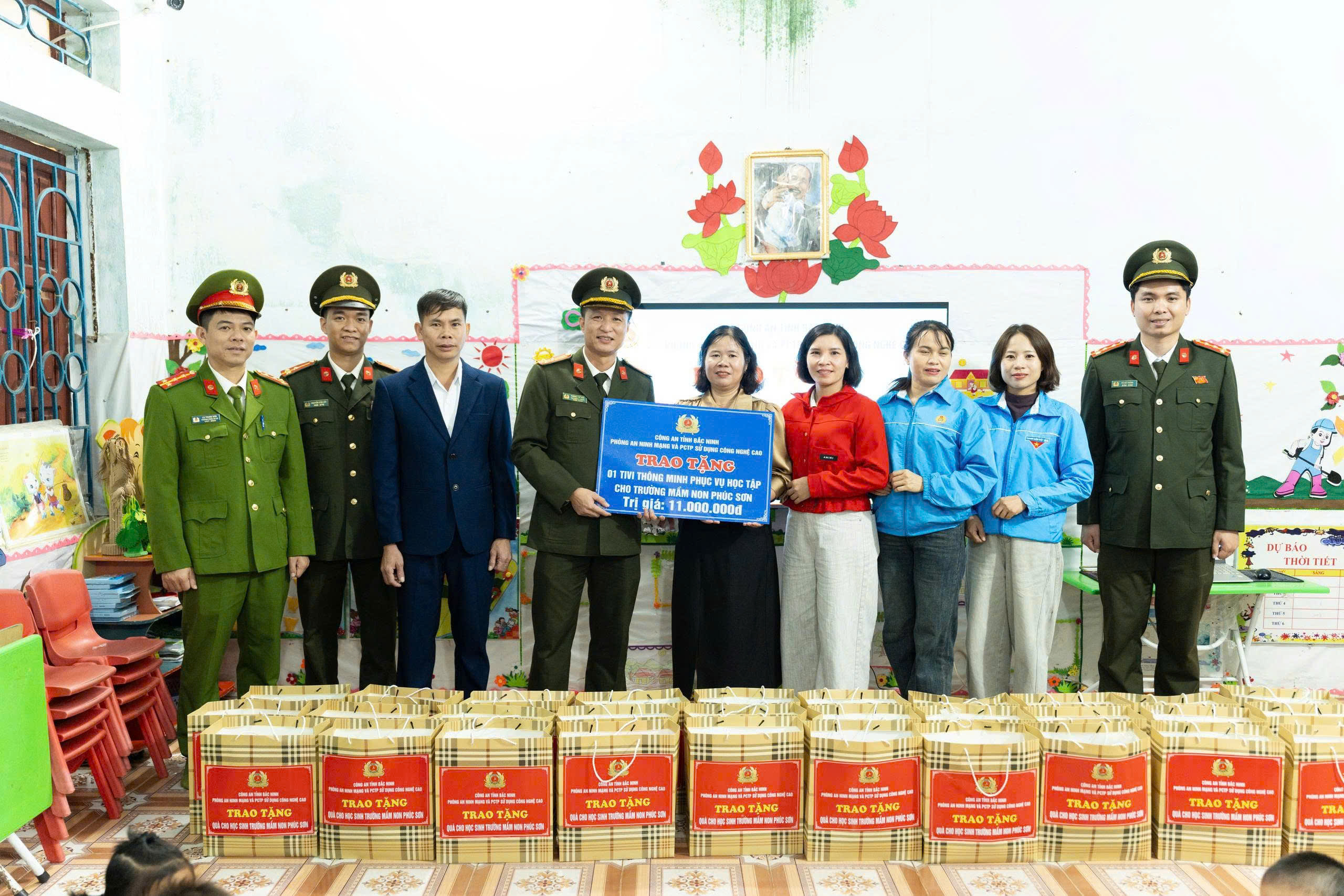 Lãnh đạo Phòng PA05 – Công an tỉnh Bắc Ninh và các đơn vị tài trợ trao tặng 01 tivi thông minh cho Trường mầm non Phúc Sơn